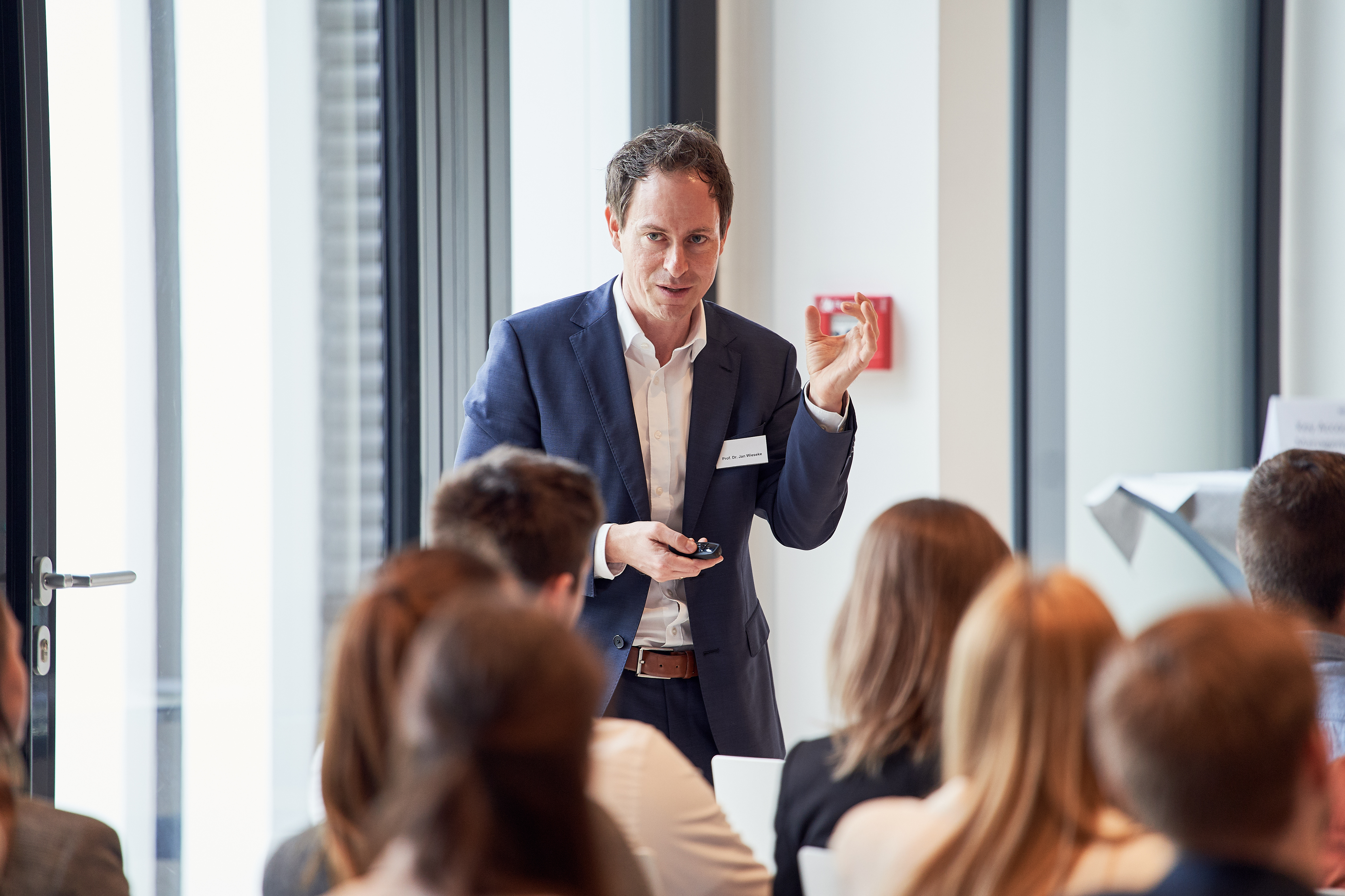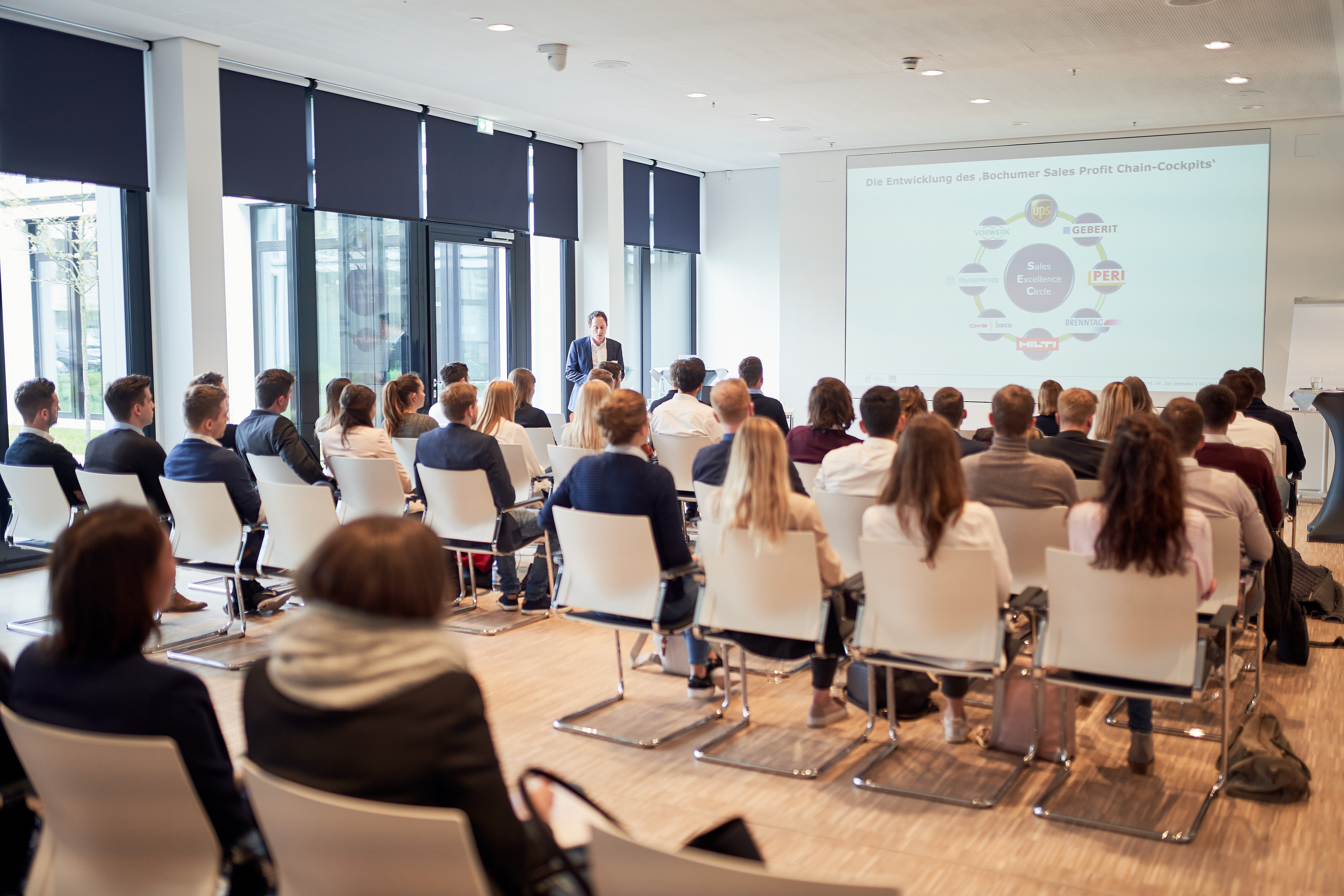 Zum Auftakt der Veranstaltung stellte Karsten Beckmann, CEO EMEA, das Unternehmen Brenntag und sein Geschäftsmodell vor. Sales Management sei das „Herz von Brenntag“, betonte Beckmann. Ein Drittel der Beschäftigten arbeite im Vertrieb; Brenntag sei eine Sales getriebene und, vor allem, eine wachsende Gesellschaft, die sich als Treiber der Digitalisierung verstehe. Anschließend hielt Jan Wieseke, Professor am SMD, eine Vorlesung zum Thema „Black Box-Entscheidungen im Vertrieb“ – eine Premiere, denn bisher wurde noch nie eine Vorlesung in Brenntags Firmenzentrale gehalten. In seinem Vortrag stellte Wieseke den Studierenden und Führungskräften von Brenntag anschaulich das Modell des „Bochumer Sales Profit Chain-Cockpits“ vor. Die von Wieseke entwickelte Denksystematik ermöglicht es, komplexe Managemententscheidungen in Teilentscheidungen herunter zu brechen. Sie identifiziert dazu zentrale Stellschrauben von Unternehmensentscheidungen und deckt Wirkungsketten zwischen den Bereichen Management, Vertrieb, Kunde und Ergebnis auf. Auf diese Weise können Unternehmen Fehler in Bereichen wie Vertriebsvergütung, Cross-Selling, Pricing und Digitalisierung künftig vermeiden.